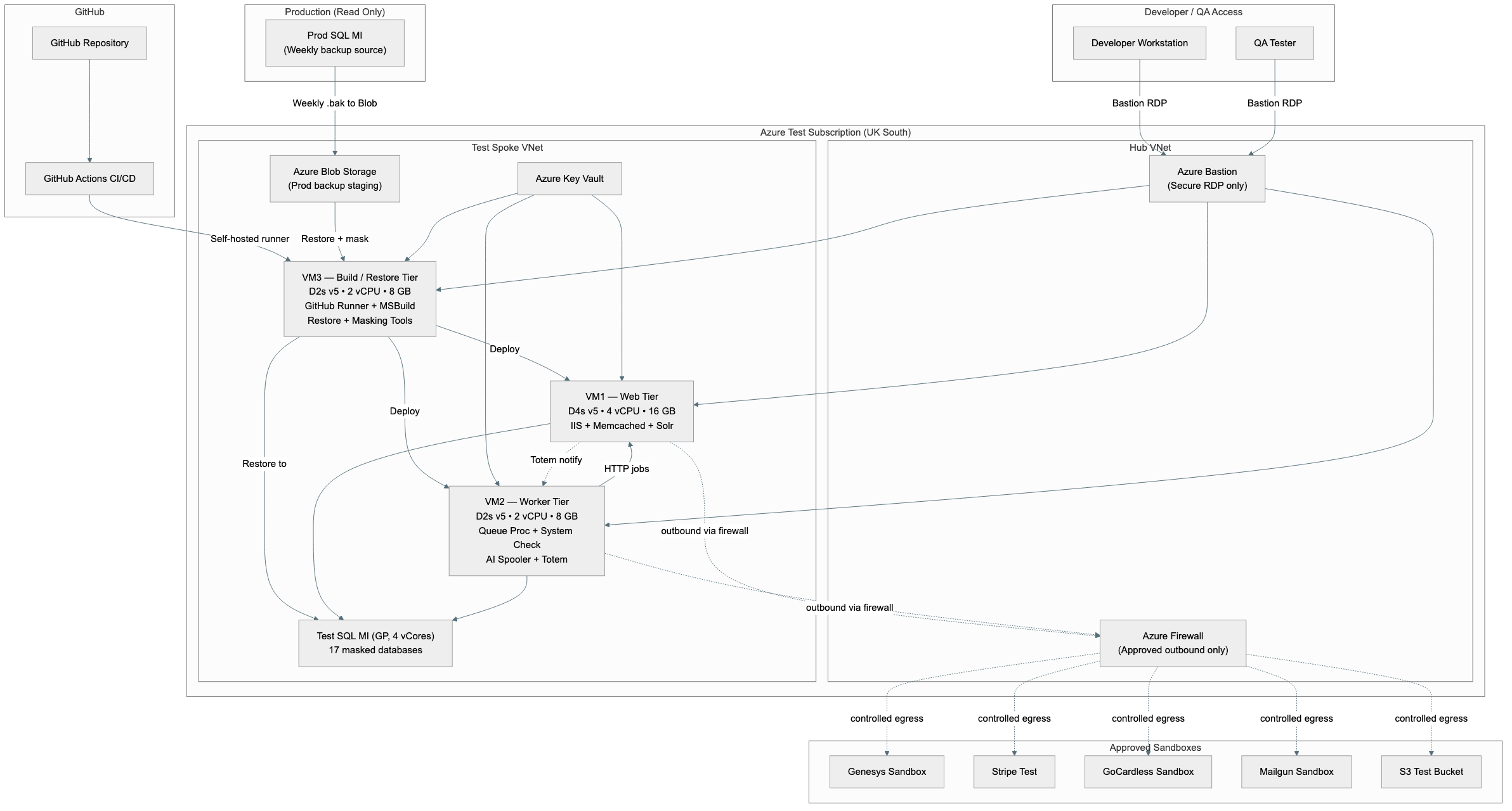 The single test SQL Managed Instance stores all 17 masked databases used by the environment. Production never connects directly to the test estate; it only places weekly backup files into Blob Storage, and VM3 restores, masks, and validates those backups before VM1 and VM2 use them. Azure Key Vault keeps the environment secrets out of the servers, and every external dependency is redirected to sandboxes such as Genesys, Stripe, GoCardless, Mailgun, and the test S3 bucket so the platform behaves like production without touching live customer data, live payments, or live telephony.